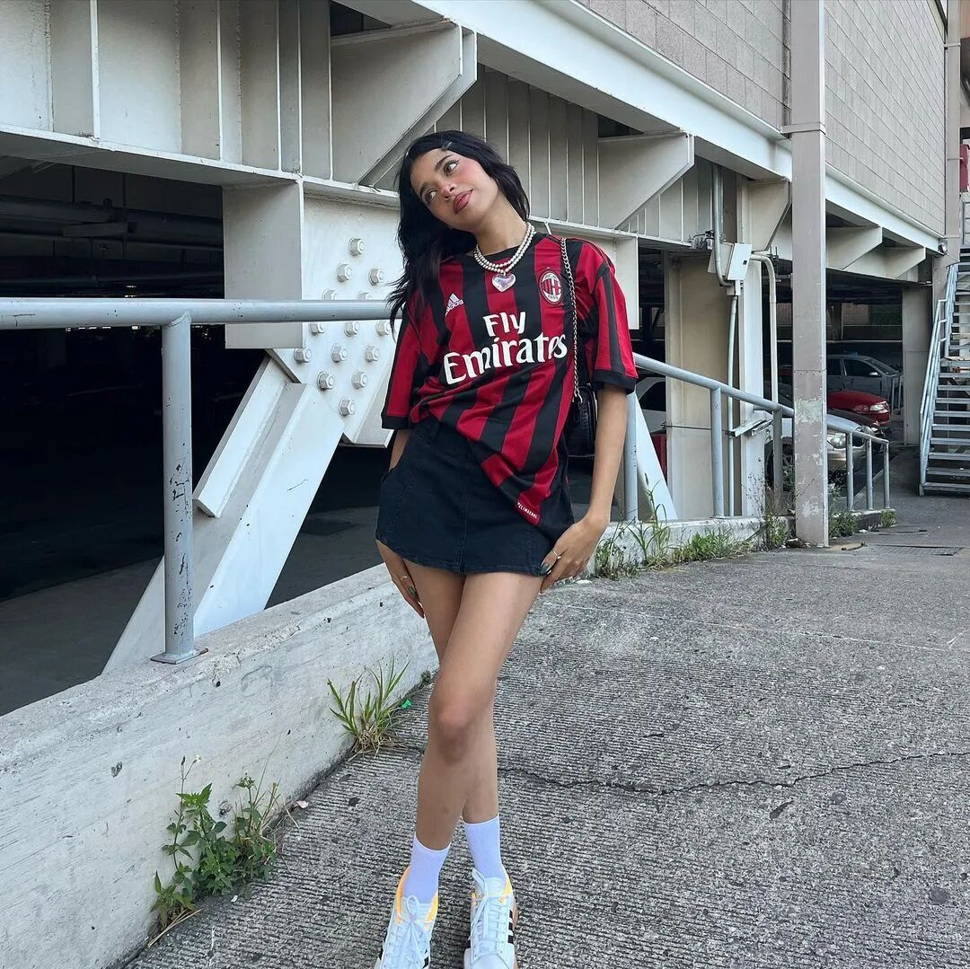 有些选择将宽松肥大的廓形球衣裁剪成紧身露脐款式,有些将衣服收进内衣边,恰到好处的露肤度尽显魅力。针对下装,她们默契地将牛仔裤换成紧身运动裤、运动短裤和百褶小短裙。