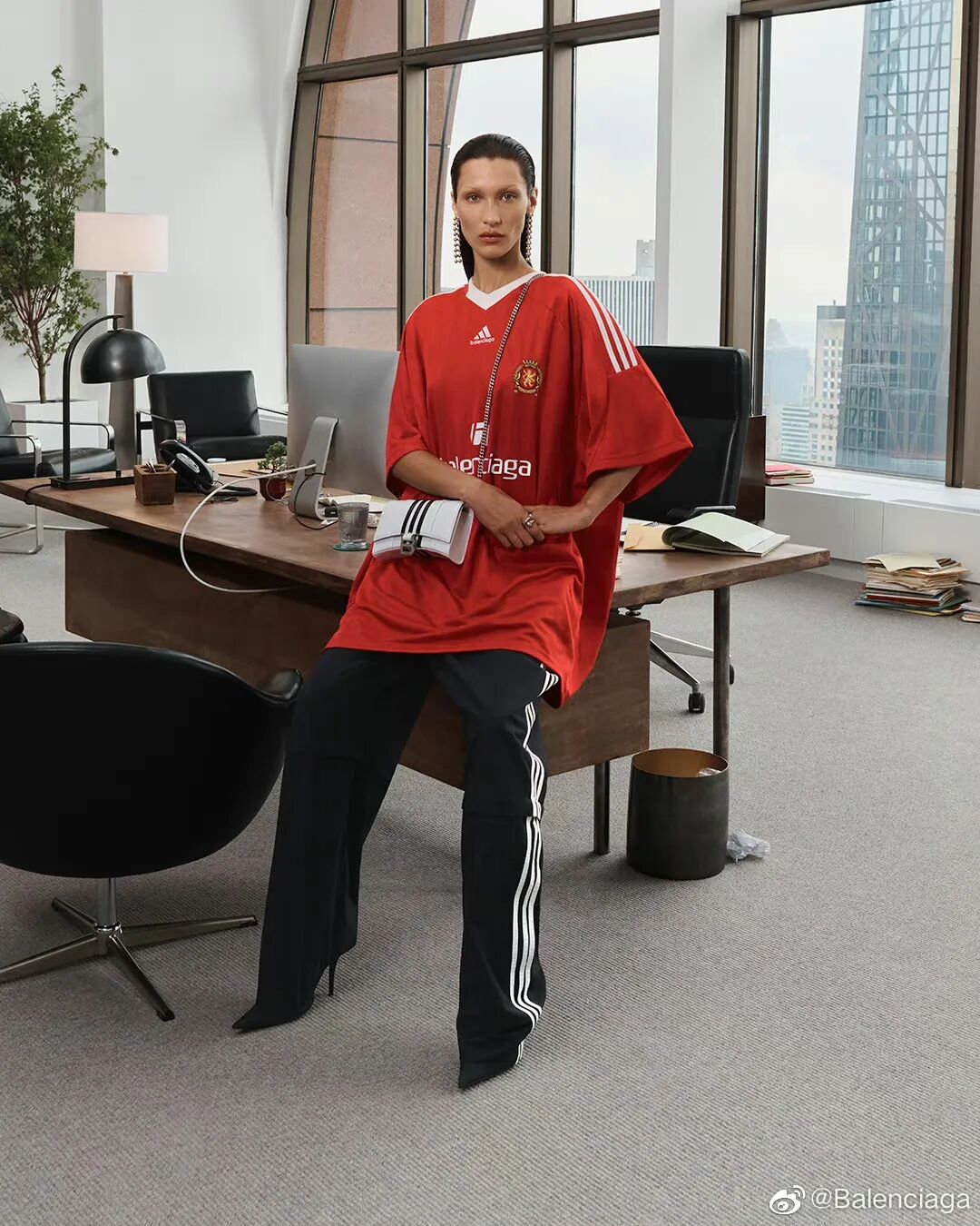 趋势之下,除了adidas、Nike等做了多年球衣生意的品牌,就连Gucci、Balenciaga这几家奢侈品也推出了复古运动系列。Balenciaga和adidas联手推出的oversize球衣,并邀请贝拉·哈迪德上身演绎。
