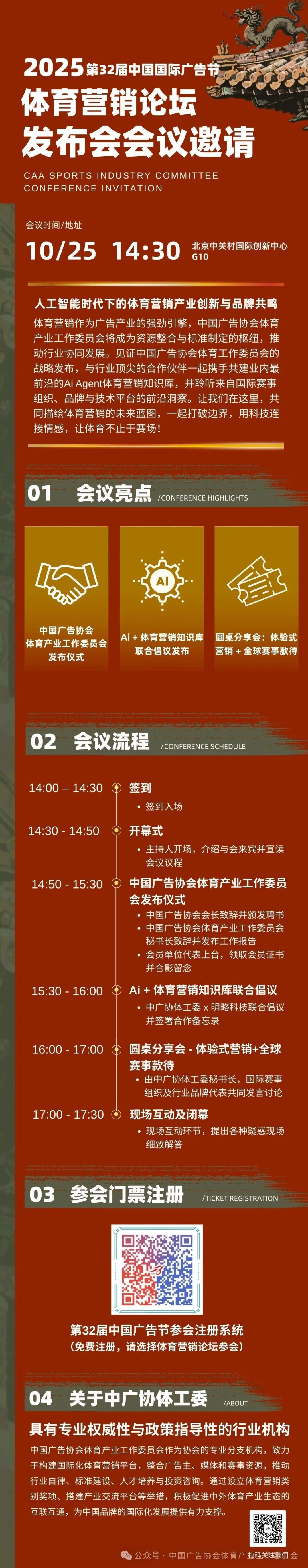 金秋十月,北京银杏染金、枫叶渐红。中国国际广告节在厦门连续成功举办五年之后,2025年,这场广告业的年度盛会重返起源地北京,并与第34届亚洲广告大会同期同地举办。双会联动,共筑国际交流新平台,本届广告节首次与亚洲广告大会(AdAsia.)深度融合,以“科技赋能·智启未来”为目标,打造国际化交流平台。在此,我们诚挚邀请您出席本届广告节“体育营销论坛”, 共同探讨体育营销的发展与未来。