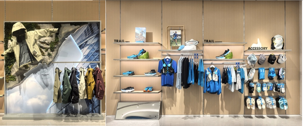 其中,深浅绿意交织的HOKA品牌墙格外吸睛——墙面从天然竹叶萃取取色,标志性飞鸟符号跃然其上,不见竹形却满含自然意趣,仿佛飞鸟正振翅飞跃山野。从展柜层板、“山体切片”再到产品陈列,HOKA把“山野基因” 贯穿始终,探索者在触摸产品、感受空间时,便能与山野生命力自然而然地同频共振。