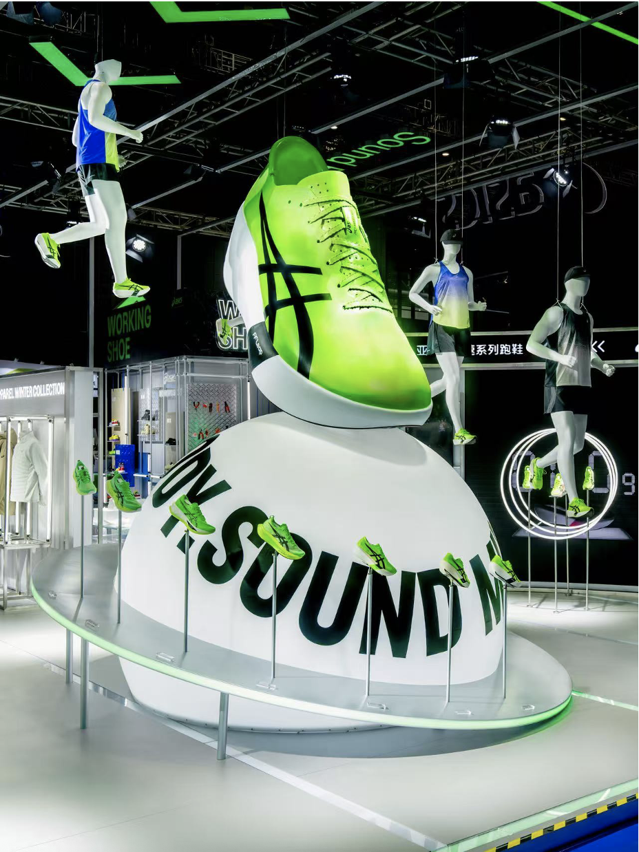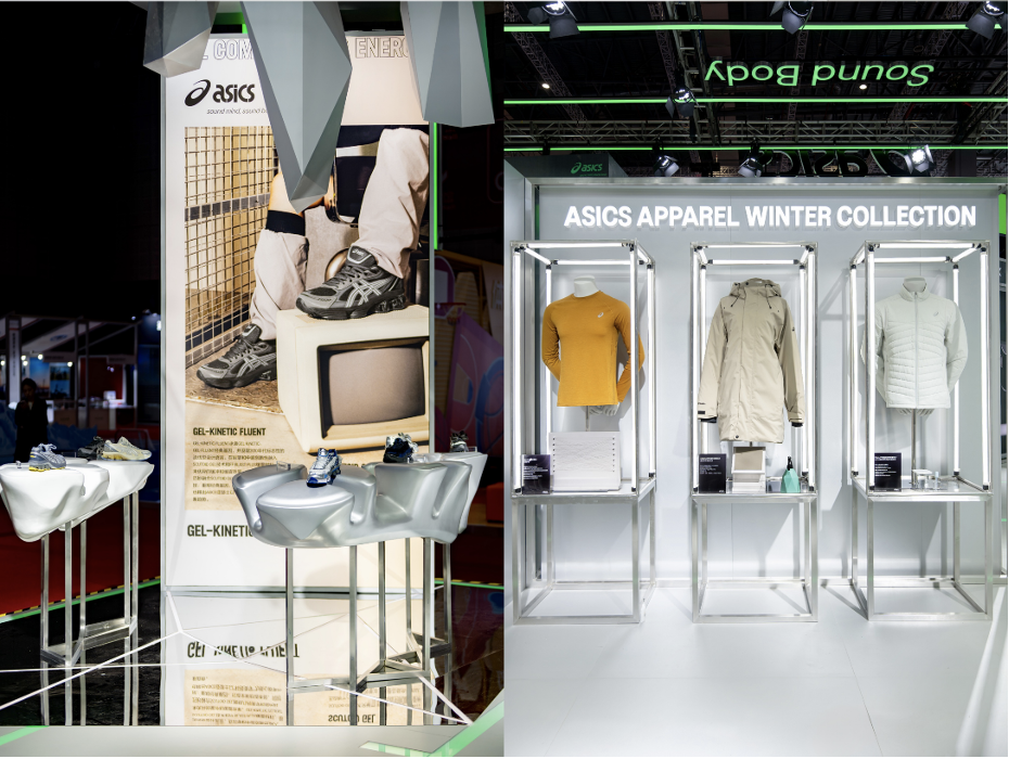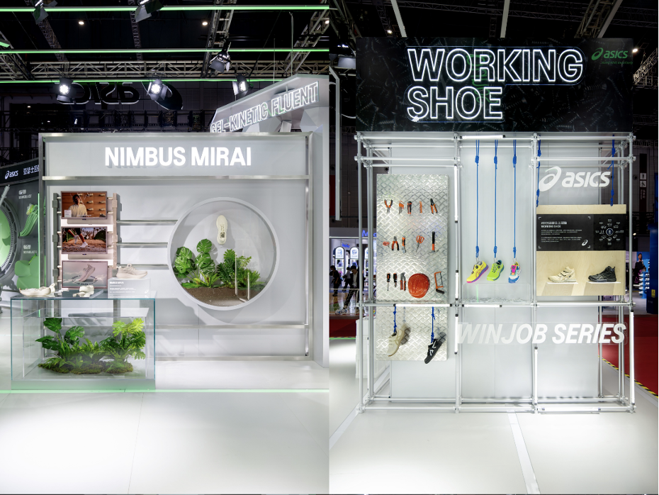 此外,ASICS亚瑟士展台亦以多元设计巧思,全面呈现品牌在潮流设计、可持续发展与服装创新领域的创新成果——首次亮相的WINJOB工程鞋专为高风险工作场景打造,以突出的坚固性与耐用性,展现品牌专业与实用兼具的设计理念;潮流鞋款 GEL-KINETIC FLUENT则以其 SCUTOID GEL 技术造型为灵感,打造几何棱柱状展示台,强化鞋款的未来感与科技美学,诠释ASICS亚瑟士在功能创新与潮流设计融合上的探索与突破。