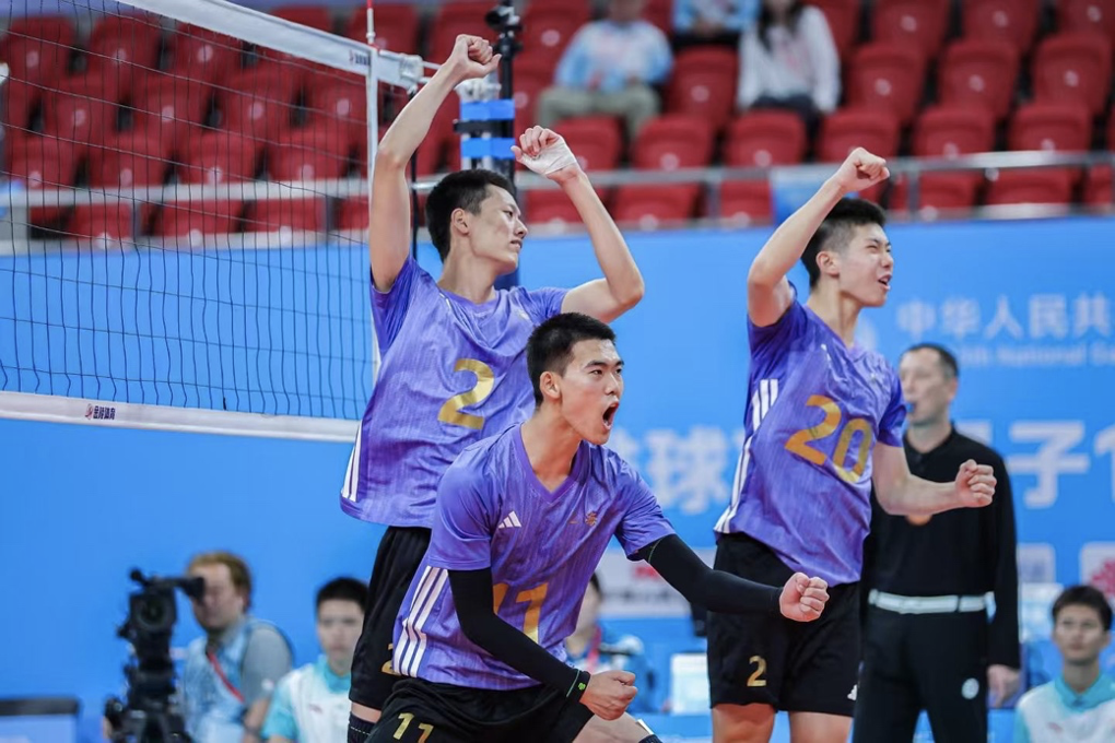 广东男排U18穿着由阿迪达斯装备间定制平台(LOCKER ROOM)定制的比赛服庆祝得分