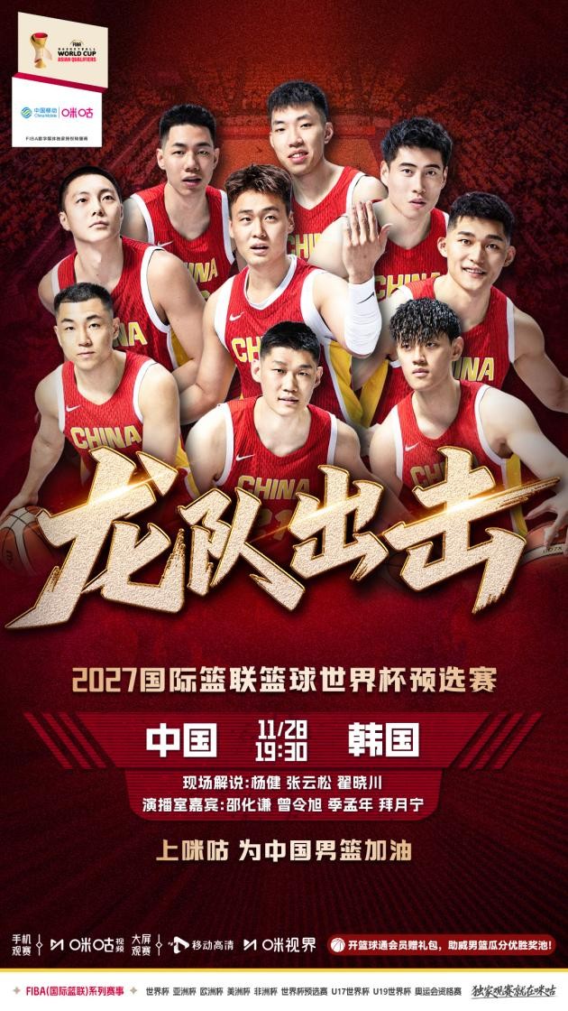 11月28日19:30,中国男篮将于北京五棵松体育馆迎来2027篮球世界杯预选赛的首次亮相,主场迎战韩国队。中国移动咪咕作为中国大陆地区FIBA未来四年的数字媒体独家持权转播商,将在咪咕视频、移动高清、咪视界为广大球迷们开启精彩的国际篮球盛宴。咪咕将通过专业解说、独家内容、沉浸式互动与观赛福利,为全国数亿球迷打造从看到玩的全新体验,陪伴中国男篮开启全新征程。