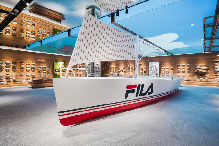 在这里,环球独航的宏大叙事与海上丝绸之路的历史及FILA百年探索的品牌精神融为一体。区域中心特别陈列了一艘复刻“FILA TRI号”的帆船装置 —— 1999年,FILA 赞助意大利帆船家吉奥瓦尼·索尔迪尼(Giovanni Soldini)驾驶该帆船原型,独自航行大西洋116天,创下了新的世界纪录。“荣耀回廊”则集中展示了品牌在航海、滑雪、登山、网球、高尔夫等领域的“冠军时刻”,以及陪伴冠军的传奇单品。从网球名将比约·博格(Björn Borg)捧杯时的胜利夹克,到“果岭皇后”南茜·洛佩兹(Nancy Lopez)标志性的NANCY POLO等 —— 每一个历史瞬间,都代表着FILA通过技术、审美的持续创新,以破浪之姿引领运动与时尚的航程。