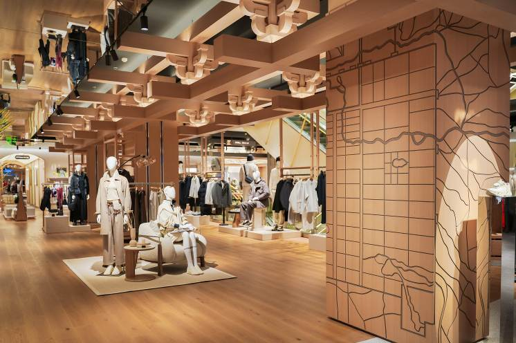 以“未来唐韵”为灵感,这一区域巧妙融合了传统中式建筑哲思与现代设计语汇。将大明宫的“抬梁式榫卯”设计进局部空间骨骼,并雕刻了唐朝宝相花纹样。这一设计在将长安建筑意象演绎为当代空间表述的同时,亦在表达品牌鼓励和引领青年文化创新的宣言:以当代科技为“卯”、丝路精神为“榫”,打破传统与潮流的次元壁,不断突破向前。