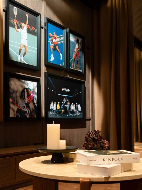 与设计语言相呼应,左侧生活区将FILA生活系列服装与精致的家居氛围摆件进行情境化搭配,让消费者能够在“生活客厅”场景中,从容选购日常生活与社交通勤所需。右侧潮流区则通过一系列模特矩阵,为追逐先锋趋势的年轻人带来引领潮流、彰显鲜明文化态度的穿搭组合。