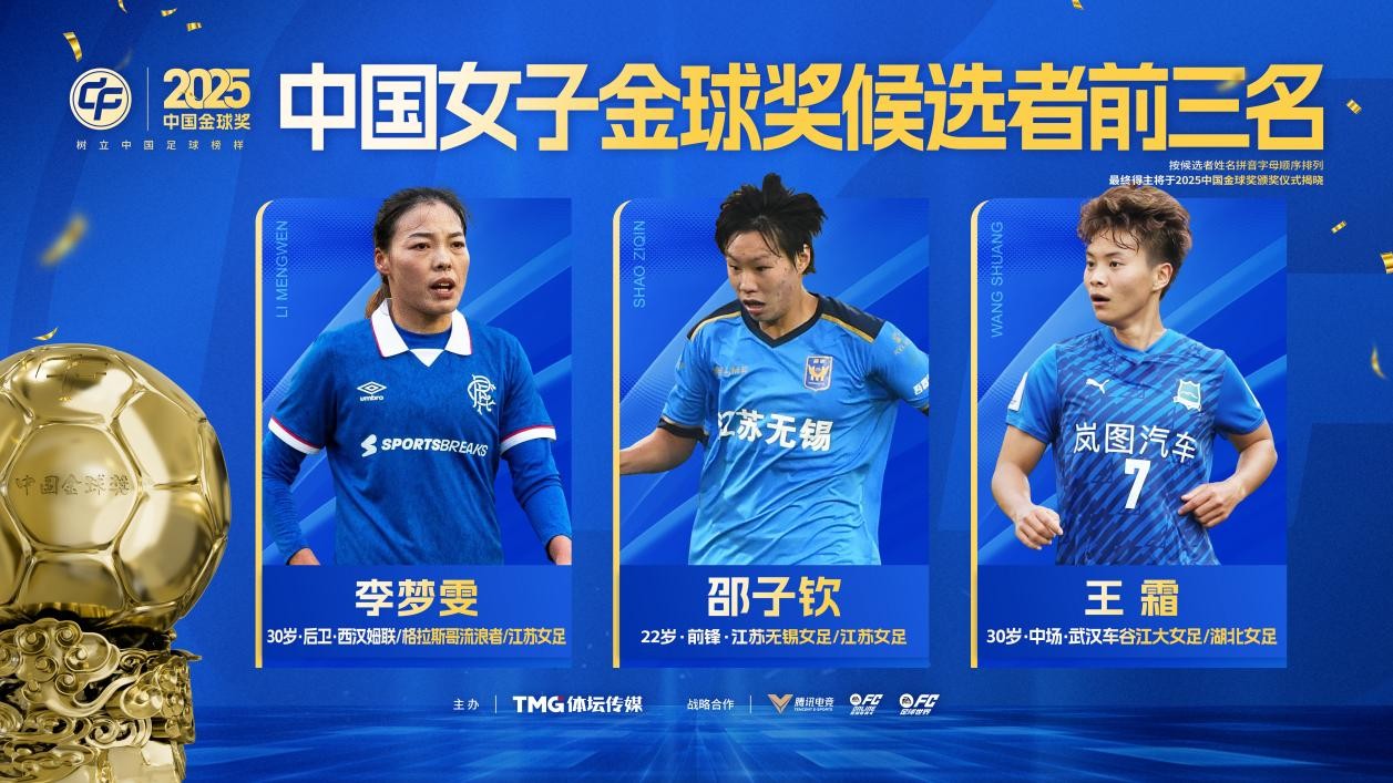 中国女子金球奖评选的前三名包括延续旅欧生涯的李梦雯、强势成为国家队年度最佳射手的邵子钦,以及在多线赛场率领武汉车谷江大创造佳绩的王霜。李梦雯在上一届评奖中就跻身前三,持续以闯荡欧洲推进职业生涯。而在国家队赛场不断破门并助力江苏队夺得全运会金牌的邵子钦,则是第一次从候选名单脱颖而出。作为中国女子金球奖历史上获奖次数最多的球员,王霜在2025年奉上诸多名场面,帮助武汉车谷江大登上亚洲之巅,强势回榜绝对实至名归。
