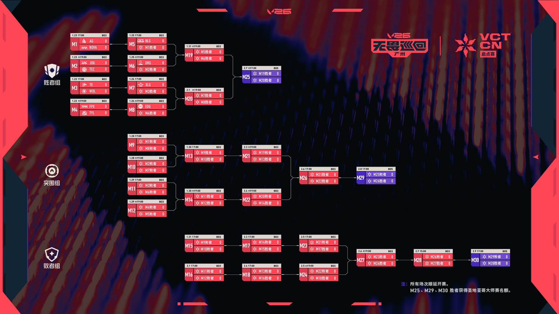 12支队伍依据2025赛季成绩抽签,其中4支晋级2025全球冠军赛的队伍将直接晋级胜者组第二轮,其余8支队伍将从胜者组第一轮开始征战。失败一次的队伍进入突围组,失败两次的队伍进入败者组,失败三次则淘汰离场。