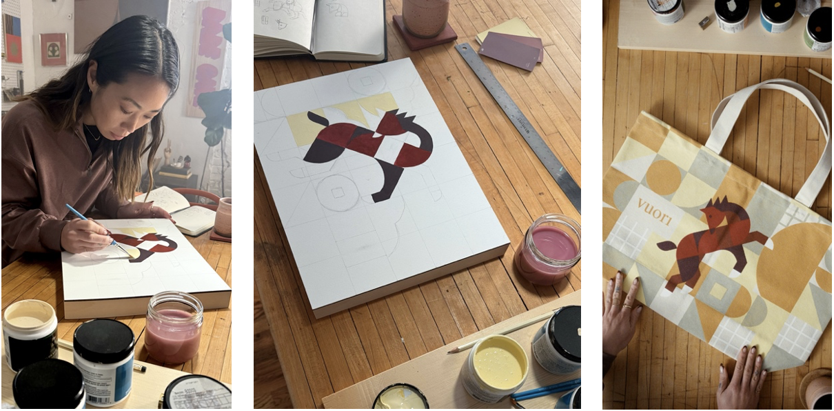 “马象征着自信、生命力与自由,” Alyssa Low 如是诠释。她以标志性的几何语言与明快用色勾勒画面,通过清晰结构与适度留白,呈现出力量与安定并存的视觉意象,亦与Vuori所倡导的从容姿态悄然呼应。