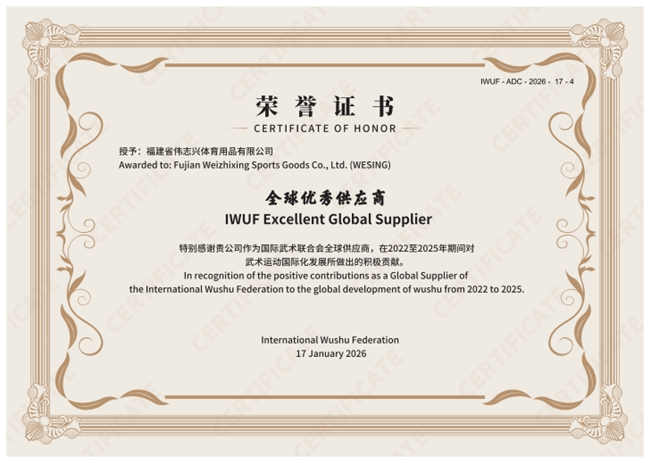 签约仪式现场,伟志兴体育荣获国际武联 “全球优秀供应商” 荣誉。这既是对伟志兴体育长期深耕武术装备领域、恪守专业初心的高度赞誉,也是对其在产品品质、技术创新、赛事服务等方面的深度认可,更是对中国民族体育品牌走向世界、服务全球武术事业的有力见证。