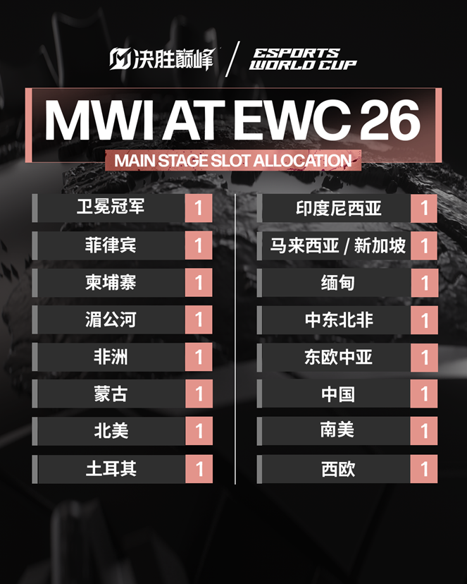 3月3日,沐瞳旗下游戏《决胜巅峰》(Mobile Legends: Bang Bang,简称MLBB)正式官宣,将连续第三年登陆电竞世界杯(Esports World Cup,简称EWC),并公布各大赛区正赛及外卡名额。本次赛事依托沐瞳全球化战略及五大赛区全新规划,进一步扩大参赛区域范围、升级赛事体系,首度迎来西欧、印度战队参赛,持续强化MLBB电竞全球扩张。