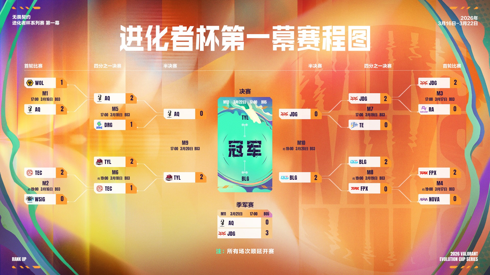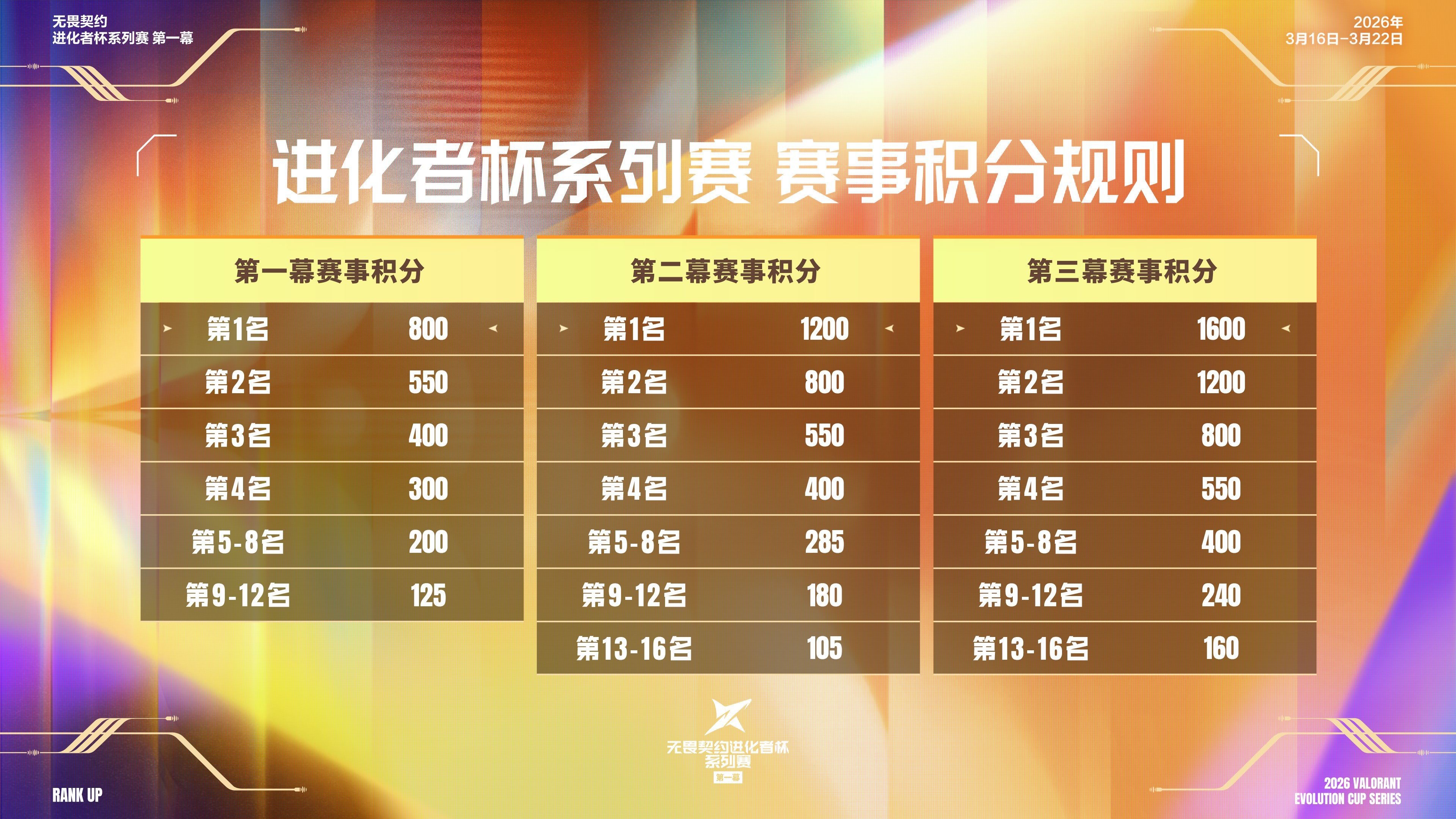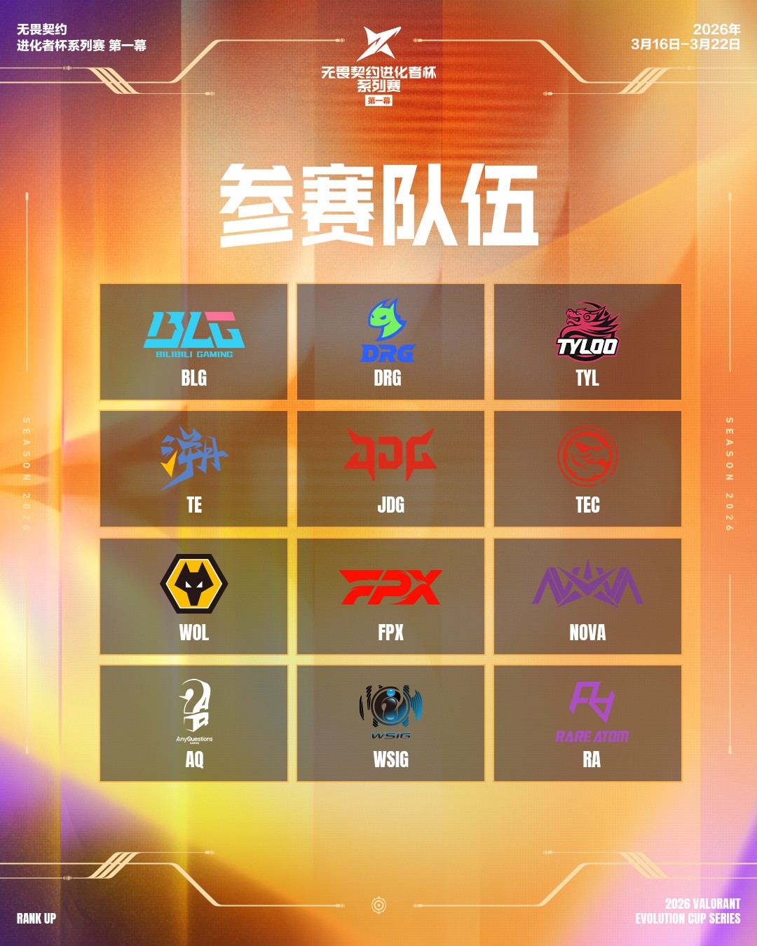 本次2026无畏契约进化者杯系列赛第一幕由9支未前往圣地亚哥大师赛的VCT CN联赛队伍(BLG、DRG、TYL、TE、JDG、TEC、WOL、FPX、NOVA)与2025年11月全国大赛专业赛道前3名队伍(AQ、WSIG、RA)共12支队伍参赛。根据2026启点赛赛果,BLG、DRG、TYL、TE四支队伍直接进入四分之一决赛阶段,其余队伍则出战首轮比赛。进化者杯系列赛第一幕除季军赛和决赛为BO5外,其余比赛均为BO3单败淘汰赛。此外,进化者积分还将作为2026年VCT CN联赛晋升赛参赛资格的主要依据。