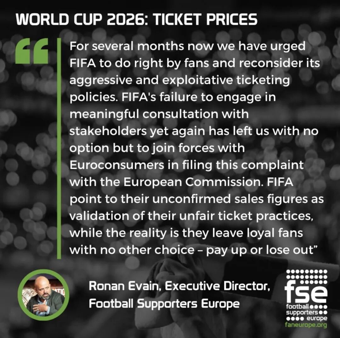 事实上,自国际足联公开本届世界杯售票方式和价格之后,相关指责就从未停息。起先仅仅是来自球迷层面,随后FSE、欧洲消协及其它球迷团体开始介入。在2025年12月,FSE也曾发表过一次声明,称2026美加墨世界杯的售票方式与价格是一次来自国际足联的「里程碑式背叛」。