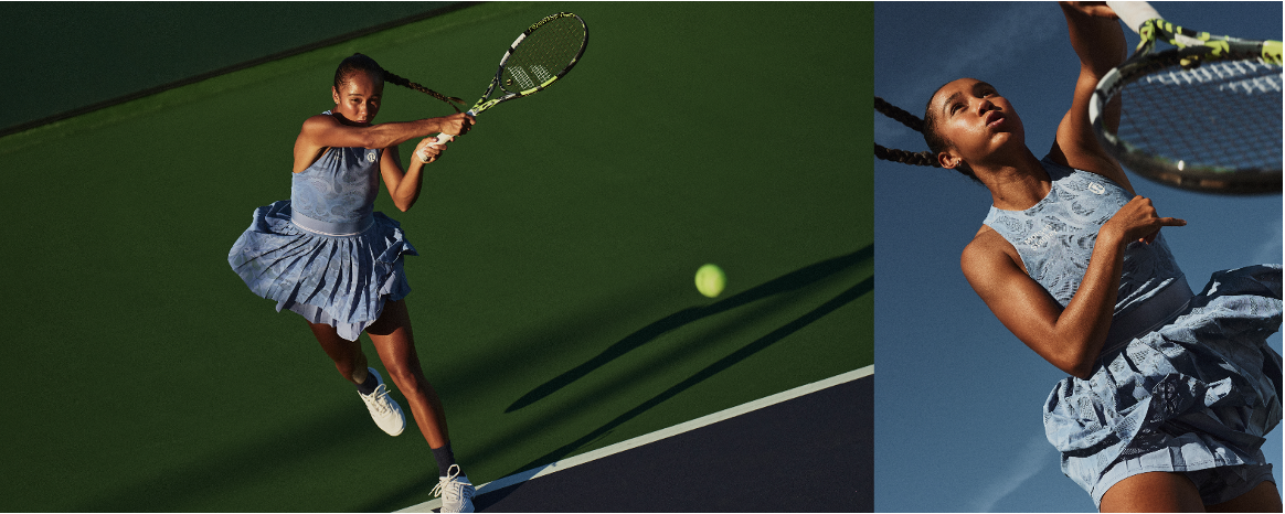 Leylah Fernandez于三月印第安维尔斯赛场上身的Paisley-Mesh⽹球涡纹图案⽹⾯⻛琴褶连⾐裙,舒适透气的涡纹网面结合肩背部工字型剪裁,伴她轻盈自如挥出每一拍。腰部学院蓝色与白色的撞色设计,搭配叠层裙摆,营造灵动飘逸的视觉层次,在专注击球中不失精致与优雅。