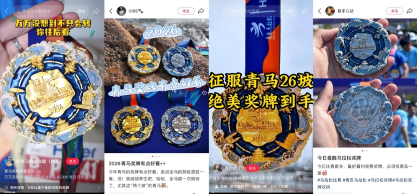 本届青岛马拉松期间,小红书、微博、抖音等平台涌现大量视频展示,话题“青岛马拉松奖牌”一度登上热搜榜。一枚城市马拉松的完赛奖牌引发如此广泛的自主传播,在此类赛事中并不常见。