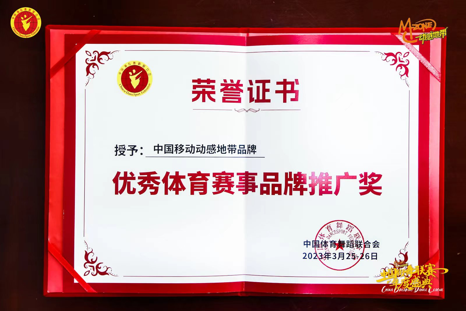 为表彰中国移动为中国街舞发展做出的卓越贡献,中国体育舞蹈联合会向中国移动动感地带品牌颁发了“优秀体育赛事品牌推广奖”,向中国移动咪咕文化科技有限公司颁发了“优秀体育赛事组织运营奖”。尹国臣会长高度赞扬中国移动长期来对街舞运动大力支持,并表示期望“未来能与中国移动加强合作,融入前沿通信技术,创新赛事运营模式,全面提升赛事影响力,创新赛事运营模式,全面提升赛事影响力,打造数智科技与潮流运动的标杆性体育赛事”。