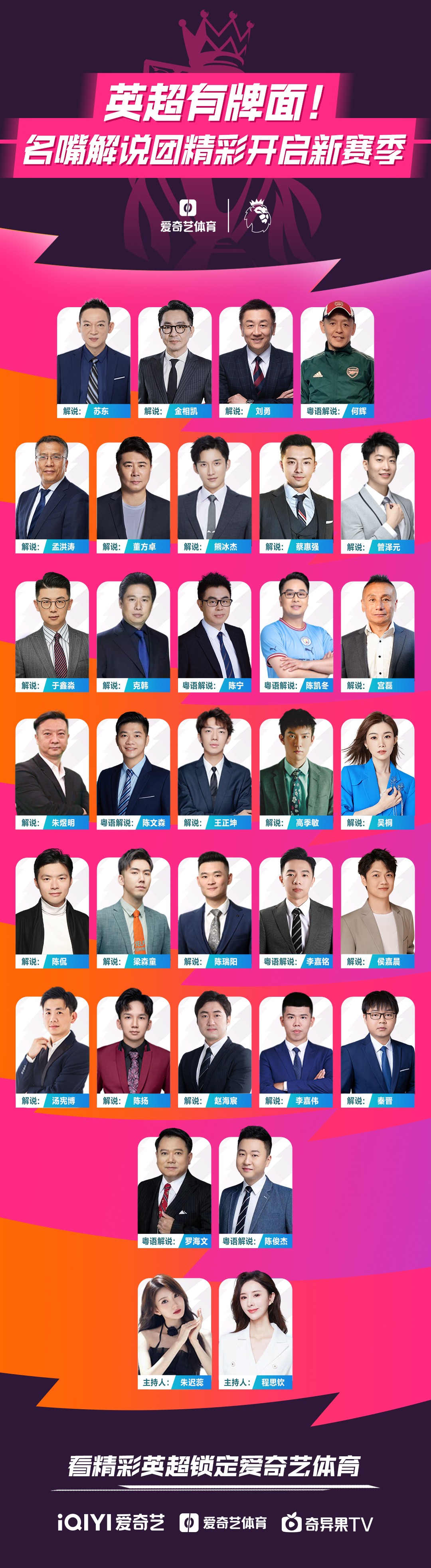 2023/24赛季英超联赛,爱奇艺体育将提供超高流畅度的1080P50帧及HDR高清画质赛事直播,同时还为球迷群体打造了更沉浸式看球的创新互动玩法,多维度提升观赛体验。爱奇艺体育英超直播将提供中、粤、英多线路解说,由30多位名嘴组成的解说天团将为球迷提供专业足球解说服务,他们将持续为球迷带来专业、深度的赛事分析解读。