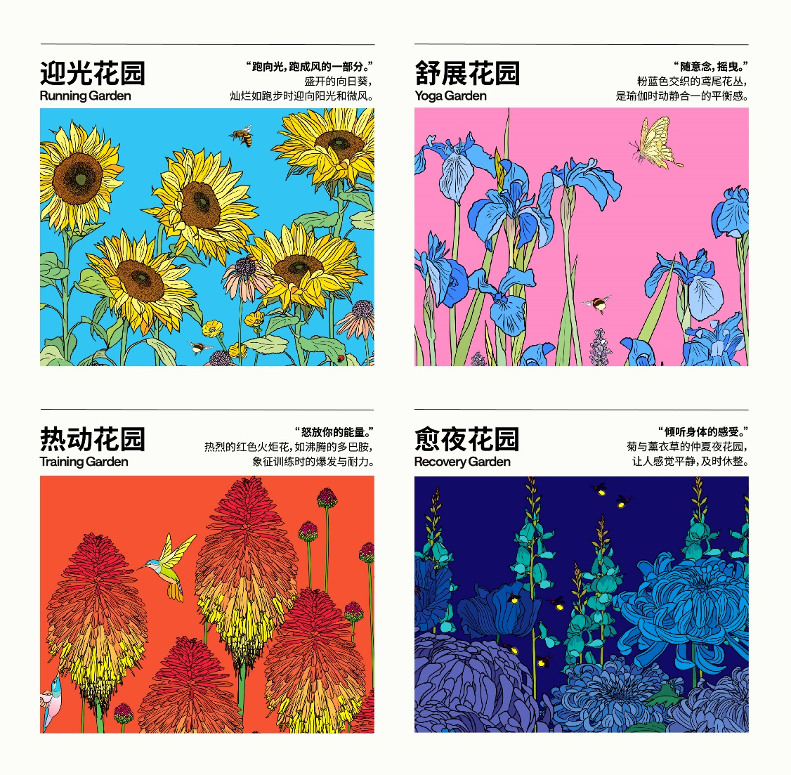 伴随着报告的发布, lululemon正式开启今年的“一起好状态”主题活动,率先吸引众人目光的是与Graphic Rewilding共同呈现的“好状态心展花园”。凭借其鲜明的色彩和丰富的寓意(不同的花卉分别代表瑜伽、跑步、训练和恢复),该艺术作品旨在邀请生活在都市中的人们动一动,让身心松动,感受自己内心的花园。