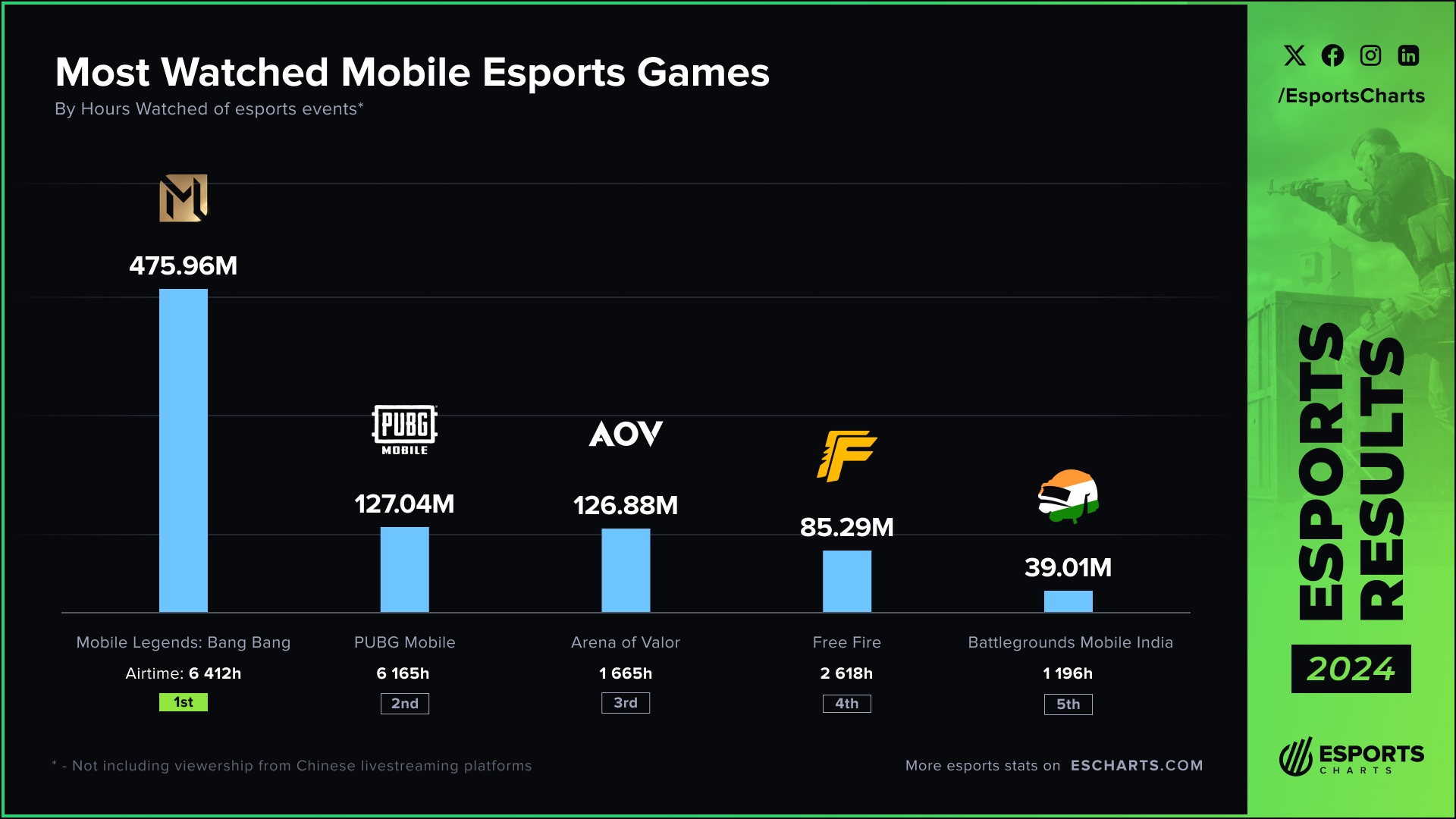 在海外权威电竞数据网站 Esports Charts 发布 2024 年度全球移动电竞收视排名中,《决胜巅峰》赛事以 4.75 亿小时总观看时长,以压倒性优势登顶 2024 年度全球移动电竞观看量榜首,打破了国外在电竞领域的长期主导,彰显出中国电竞已达世界前沿的收视实力。2025年2月,《决胜巅峰》成功入选 2026 年日本爱知・名古屋亚运会电竞比赛项目。
