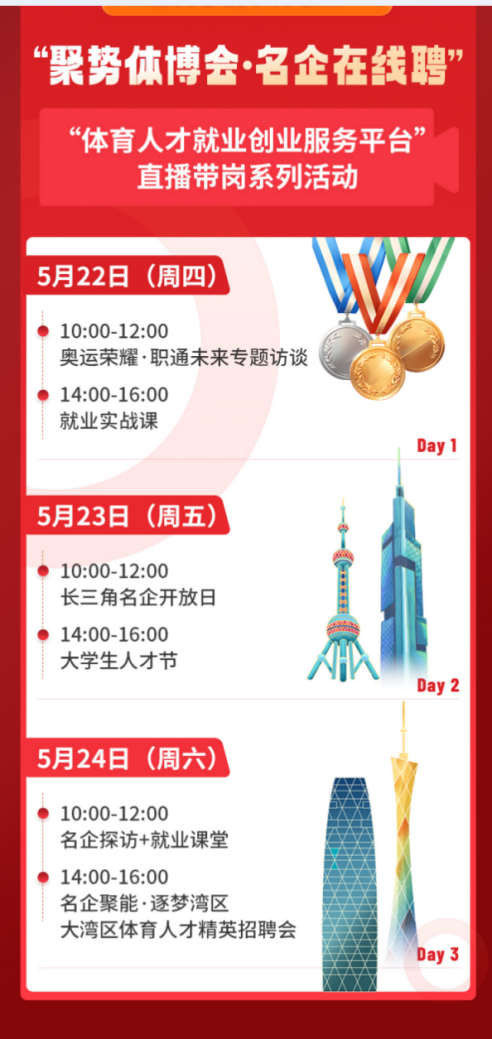 “国家体育总局体育人才就业创业服务平台(中国体育招聘)”通过官方微信视频号等社交网络渠道,邀请知名运动员、行业导师、企业资深HR,开设就业指导课堂,开通“职通江浙沪——长三角体育名企招聘专场”“乐刻运动大学生人才节”“名企聚能·逐梦湾区——大湾区体育人才招聘专场”,十余家知名企业在线解读岗位需求、现场招聘,实现“技能提升—简历投递—面试辅导”全流程闭环。