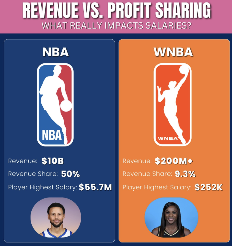 和包括NBA在内的大多数职业联盟一样,WNBA联盟的收入来源主要包括门票销售、周边商品销售以及电视转播权协议,而WNBA也会根据这些收入去设定一个比例(Revenue Sharing),去规定球员们能拿到多少薪水。