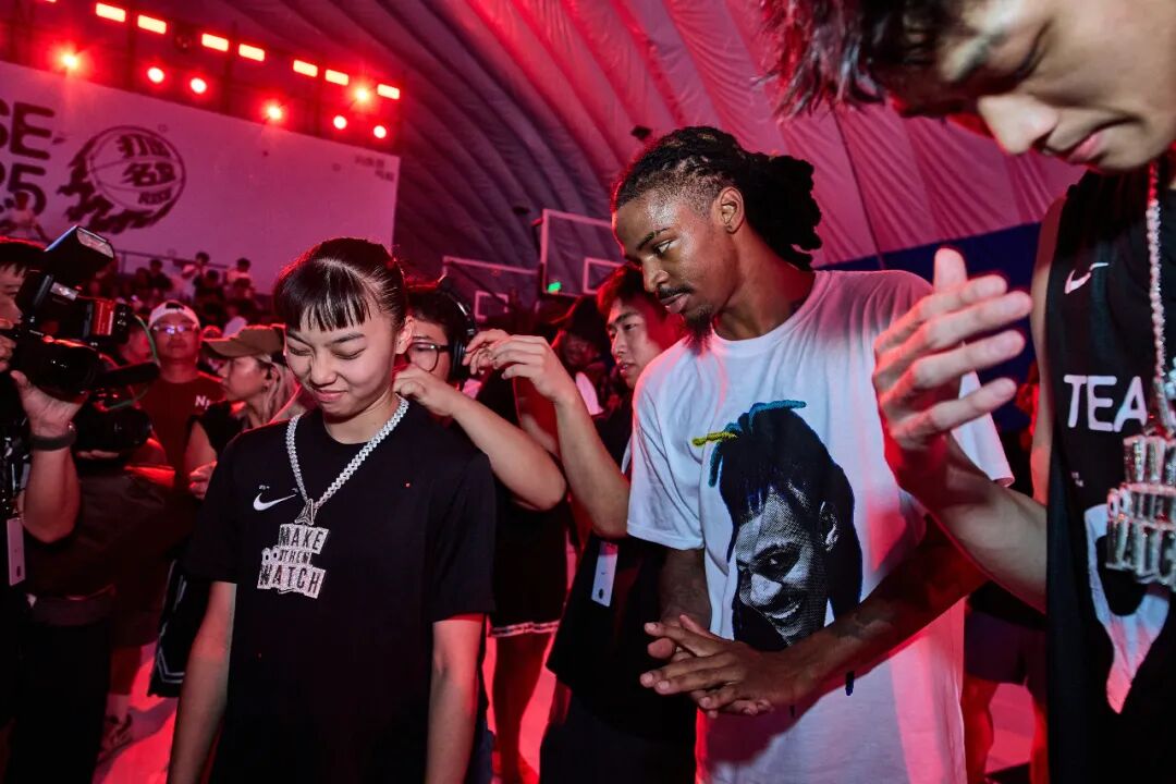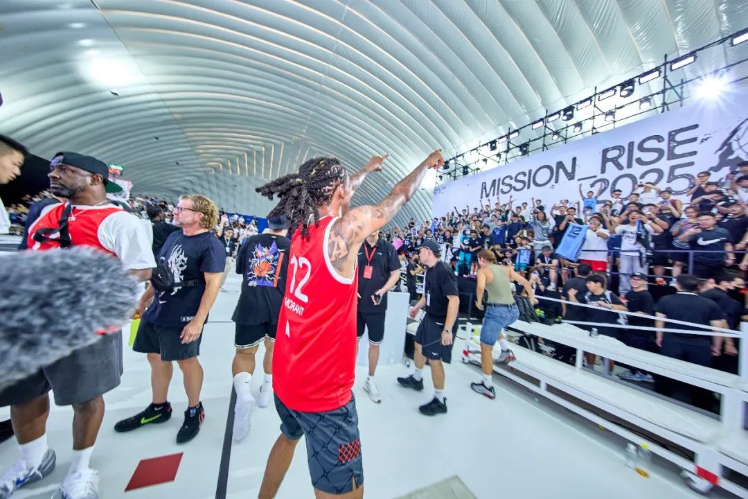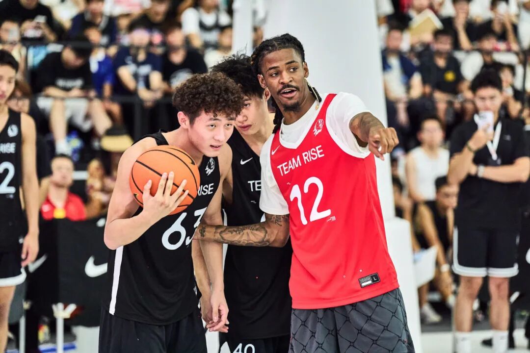 例如,在深圳站的训练营中有这样一幕:一个身穿 RISE 战袍的球员,接到莫兰特空接传球完成上篮后,与相隔半个球场的莫兰特,同时做出了标志性的庆祝动作。