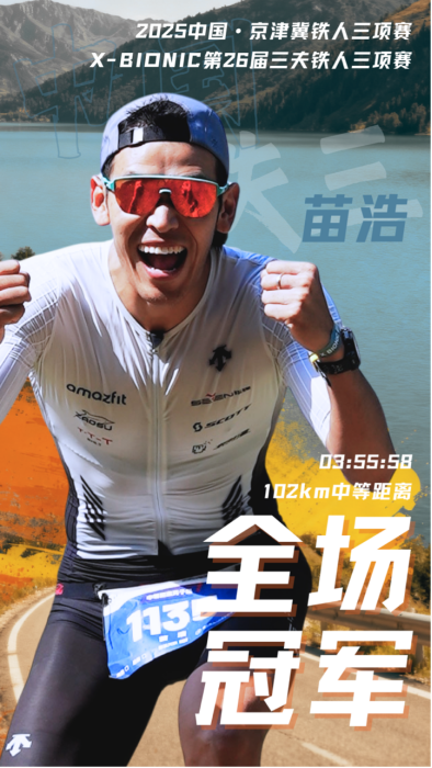2025年9月21日,中国・京津冀铁人三项赛暨X-BIONIC第26届三夫铁人三项赛在北京市平谷区金海湖景区举行。中国首位职业铁三运动员苗浩以3小时55分58秒的成绩断层第一夺冠。这也是苗浩在金海湖赛场上第四次夺冠。