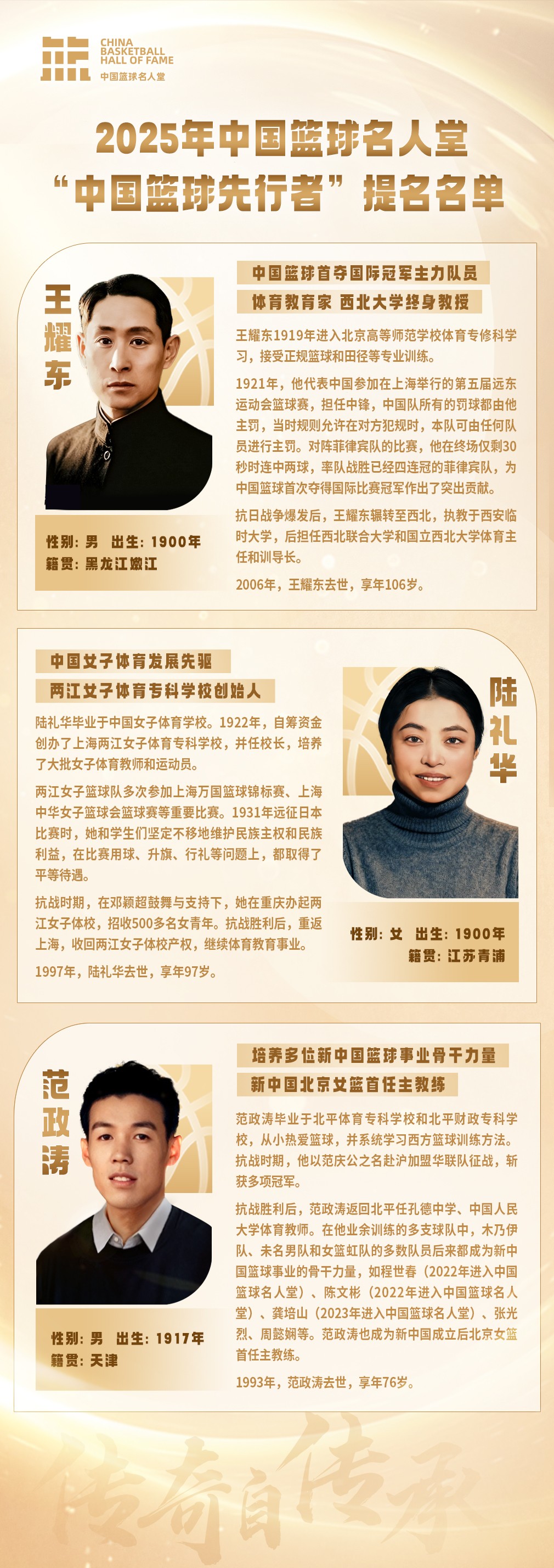自1895年篮球运动传入中国,在一代代先行者的不懈探索与无私奉献下,中国篮球历经了百余年波澜壮阔的发展历程。中国篮球先行者举荐工作是对中国篮球早期开拓者的崇高致敬,也是对中国篮球传播与发展历程的系统梳理与精神传承。2025年“中国篮球先行者”提名名单已确定:王耀东、陆礼华、范政涛三位进入提名名单。