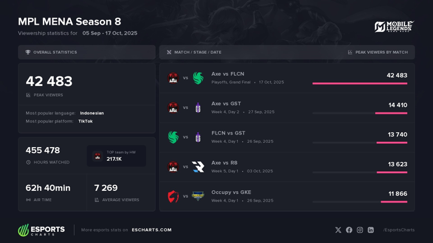 据第三方权威电竞数据平台Esports Charts统计,MPL MENA第8赛季创下多项新收视纪录。与上一赛季相比,最高峰值在线观看人数(PCU)达到42475人,提升66%;平均同时在线观看人数(ACU)为7268人,增幅为23%,创下该赛事ACU最高纪录;总观看时长突破455459小时,增幅12%。这些数据充分凸显MPL MENA联赛的观众规模持续成长,该赛事的地区影响力稳步提升。