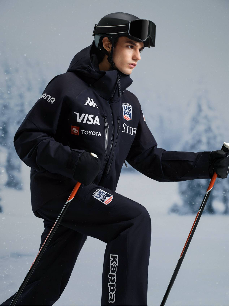 保暖滑雪长裤与上衣同样采用双层机械弹力面料,具 WATERPROOF PROTECTION 20,000 mm H2O 防水技术,BREATHABILITY 20,000 g/m²/24h 透气性能,并经过 PFC-Free 防水处理,以及填充 Fellex® 80 克保暖材料。右腿处装饰 USA 滑雪队徽标,左腿点缀 Kappa 品牌标识。可调节背带设计满足不同体型需求,立体剪裁则确保运动员在深雪环境中仍能活动自如。