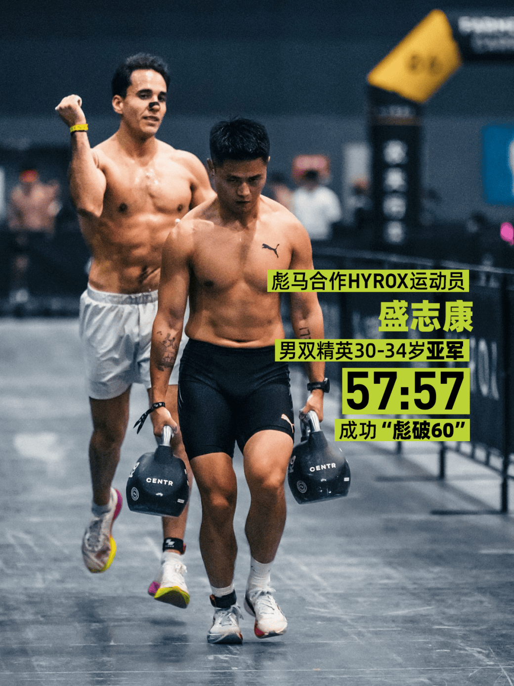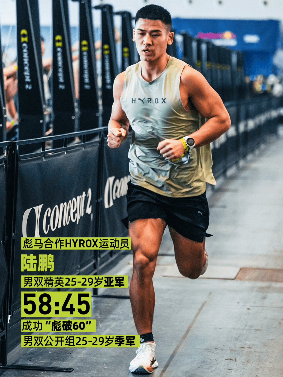 HYROX风潮席卷国内,推动赛事水准持续跃升,中国选手的表现也因此不断突破。本站比赛中,彪马中国合作的HYROX运动员盛志康、陆鹏,以及彪马战队成员马东昊、胡志博,在男双精英组别中均于60分钟内完赛,成功「彪破60」。