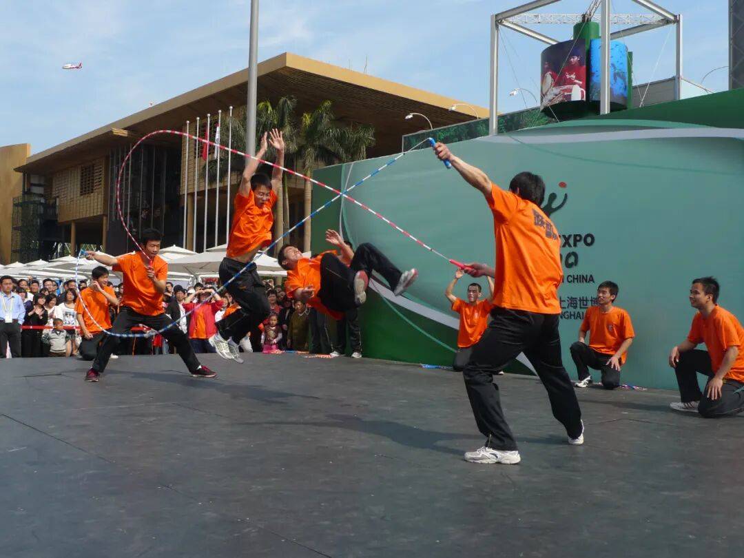 韩耀刚与队友在上海世博会上表演花样跳绳
