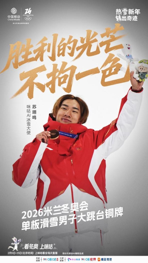 苏翊鸣的成长轨迹,正是一部“超越极限、挑战自我、顽强拼搏”的奋斗史诗。从北京到米兰,从天才少年到冰雪中坚,他始终以行动诠释着直面挑战、永不止步的体育精神内核,这正与中国移动咪咕品牌长期弘扬并积极倡导的体育精神高度契合。正是基于这份共鸣,双方在冬奥前夕正式开启合作,携手以非凡的号召力和影响力,激发全民冰雪热情。本届冬奥会期间,这股合力正转化为强大的推动力,引领并吸引着更多人走进冰雪、热爱冰雪。