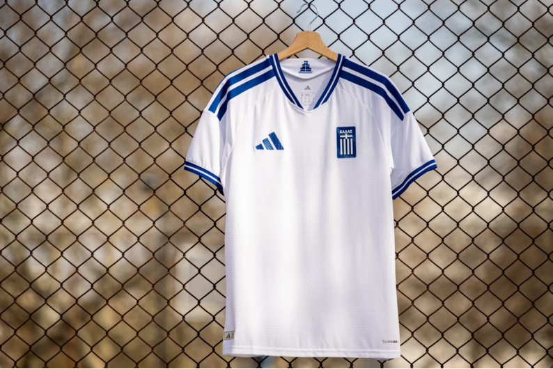 球衣以纯净白色为基底,点缀醒目灵动的蓝色细节,经典配色直观呼应希腊的标志性国家色彩。阿迪达斯标志性三条纹沿肩部与衣袖延伸,塑造出永不过时的赛场视觉格调;衣领与袖口处的精致罗纹镶边,为球衣增添简约而现代的细腻质感。球衣核心位置饰有标志性航海徽章,作为希腊足球的经典身份象征,赋予球衣鲜明的荣耀感与专属气质。整体版型将现代竞技线条与精心融入的希腊本土元素有机结合,既致敬希腊足球的历史传承,也彰显其深厚的文化底蕴。