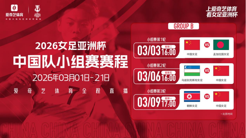 3月1日起,锁定爱奇艺体育,见证中国女足的亚洲征程,为铿锵玫瑰打call到底!