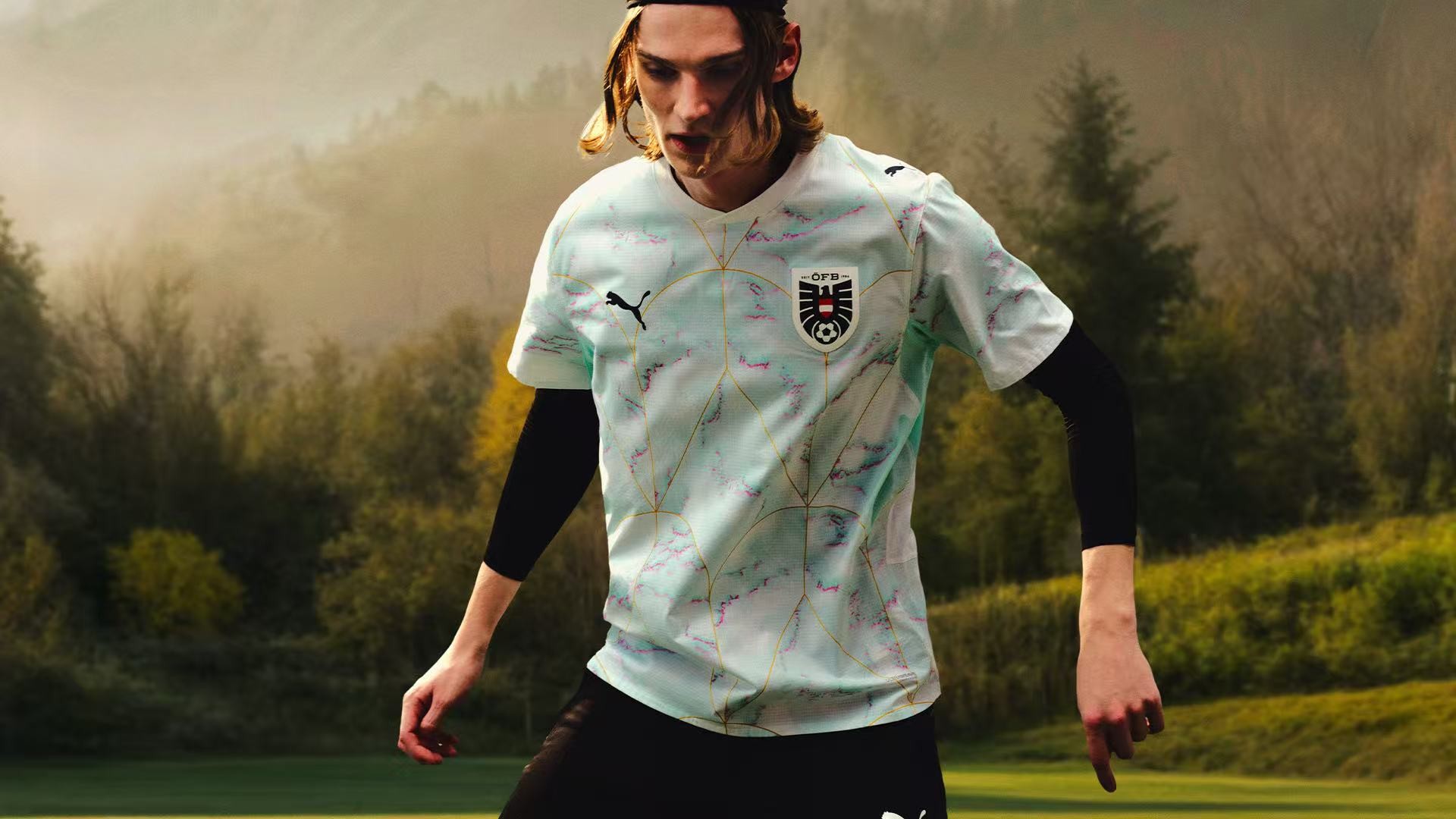 欧洲中坚力量——奥地利队的世界杯球衣设计则诠释了豪不妥协的竞技精神——传统红黑配色主场搭配富有流动感、灵感源自阿尔卑斯山的客场设计。