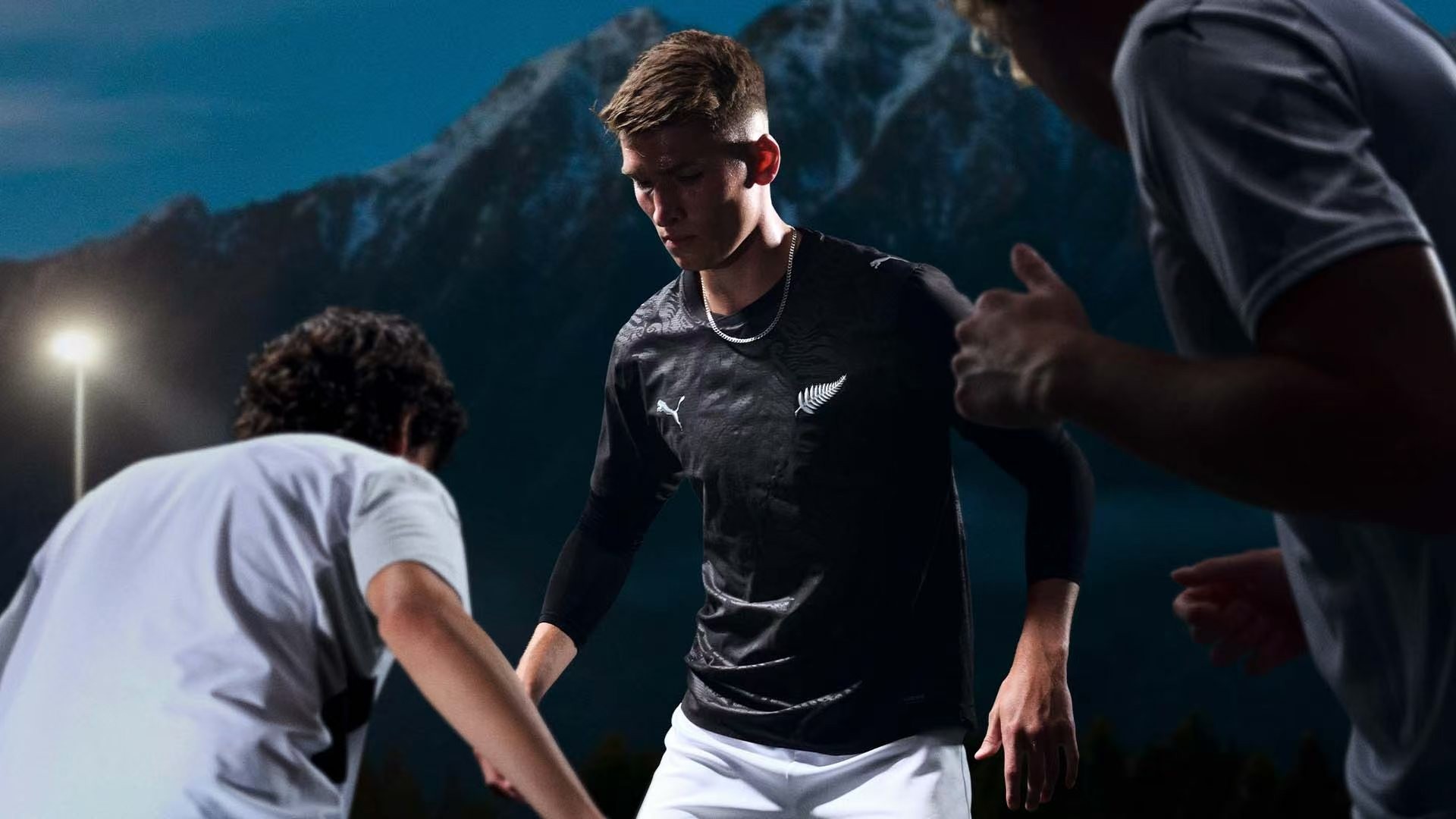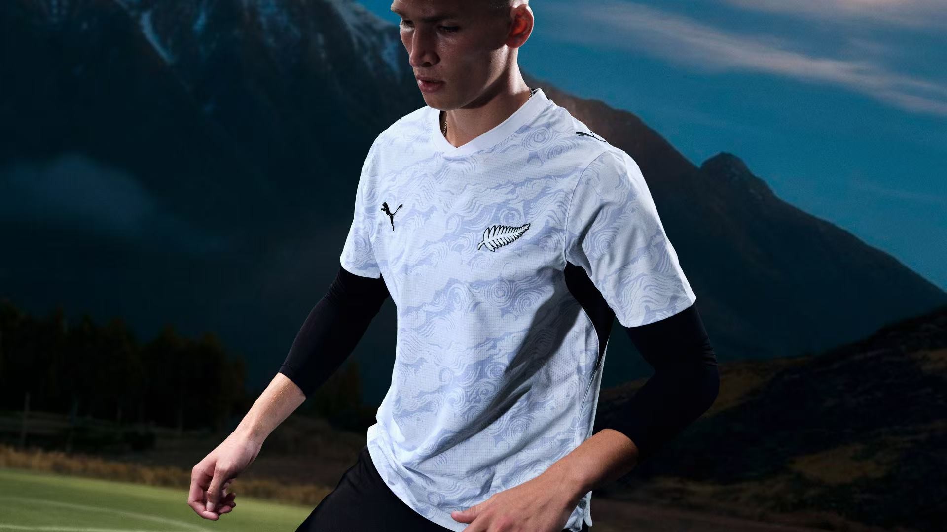 新西兰国家队则以纯粹而安静的力量诠释设计语言。主场黑色球衣加入自然景观纹理,客场则采用柔和冰蓝色。