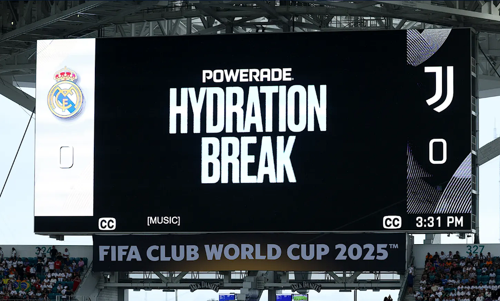 不过在这种情况下,广告资源的销售范围会受到限制,只能出售给国际足联的赞助商。例如在2025年的世俱杯上,补水时间的冠名位是FIFA官方赞助商可口可乐旗下的子品牌——Powerade(动乐),不过当时的露出形式主要是在现场大屏幕,而不是转播画面。