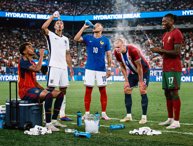 去年12月,FIFA宣布了一项新安排:2026年世界杯的所有比赛都将设置强制补水时间。上下半场各会有一次补水暂停,每次大约3分钟,两次合计约6分钟。