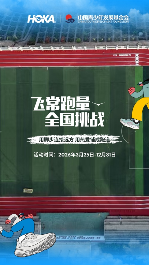 即日起至2026年12月31日,跑者可登录“悦跑圈”APP参与“飞常跑量”全国挑战,上传跑步里程,自动兑换为公益能量,汇入年度跑量目标池。每累计一公里,都是对青少年梦想跑道的真实贡献。HOKA诚邀全国跑者一起,用脚步连接善意,用奔跑点亮希望,共同为更多孩子铺就通往未来的跑道。