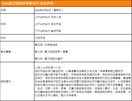 富卫保险连续八年冠名赞助“富卫保险冠军赛马日”,持续支持这项世界级赛马盛事,并通过融合体育、娱乐与旅游元素,进一步丰富观赛体验,吸引更多旅客亲临香港、走进沙田马场,传递“Celebrate living”的品牌承诺,同时推动香港文体旅发展。去年的“富卫保险冠军赛马日”吸引超过4.6万名观众入场,现场气氛热烈,当中包括众多来自海内外的马迷;超过八千名内地旅客到场参与,客增长60%创下新纪录。今年赛事将继续汇聚世界级赛驹、精彩演出及多元互动体验,进一步展现香港作为国际盛事之都的吸引力。