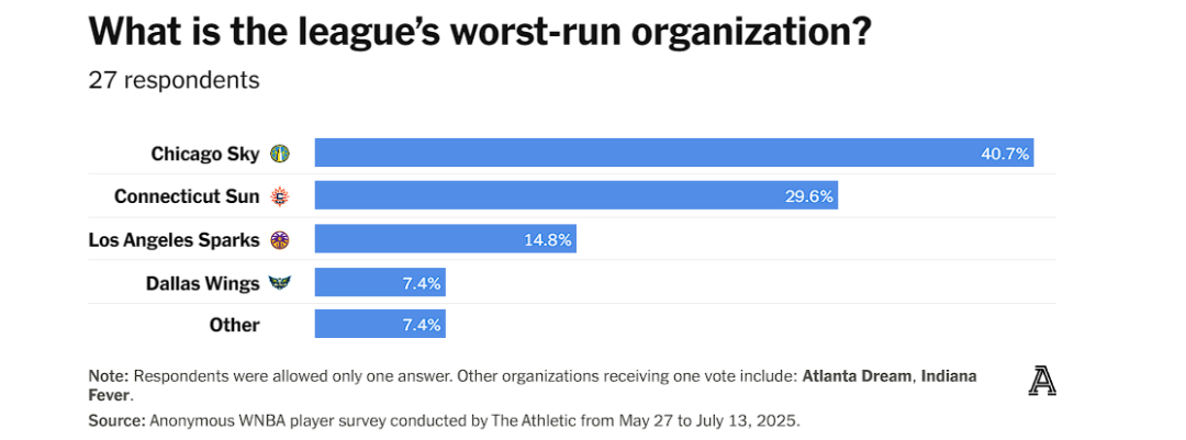 比如,球队长期没有专属训练馆,康州的地理位置和出行条件也一直被球员诟病。ESPN此前在球员调查中就引过Alyssa Thomas的评价,称康州是联盟里「最糟糕的出行环境之一」;去年《The Athletic》的匿名球员调查中,也有球员表示「基础设施」「出行和地理位置让这里缺乏吸引力」。