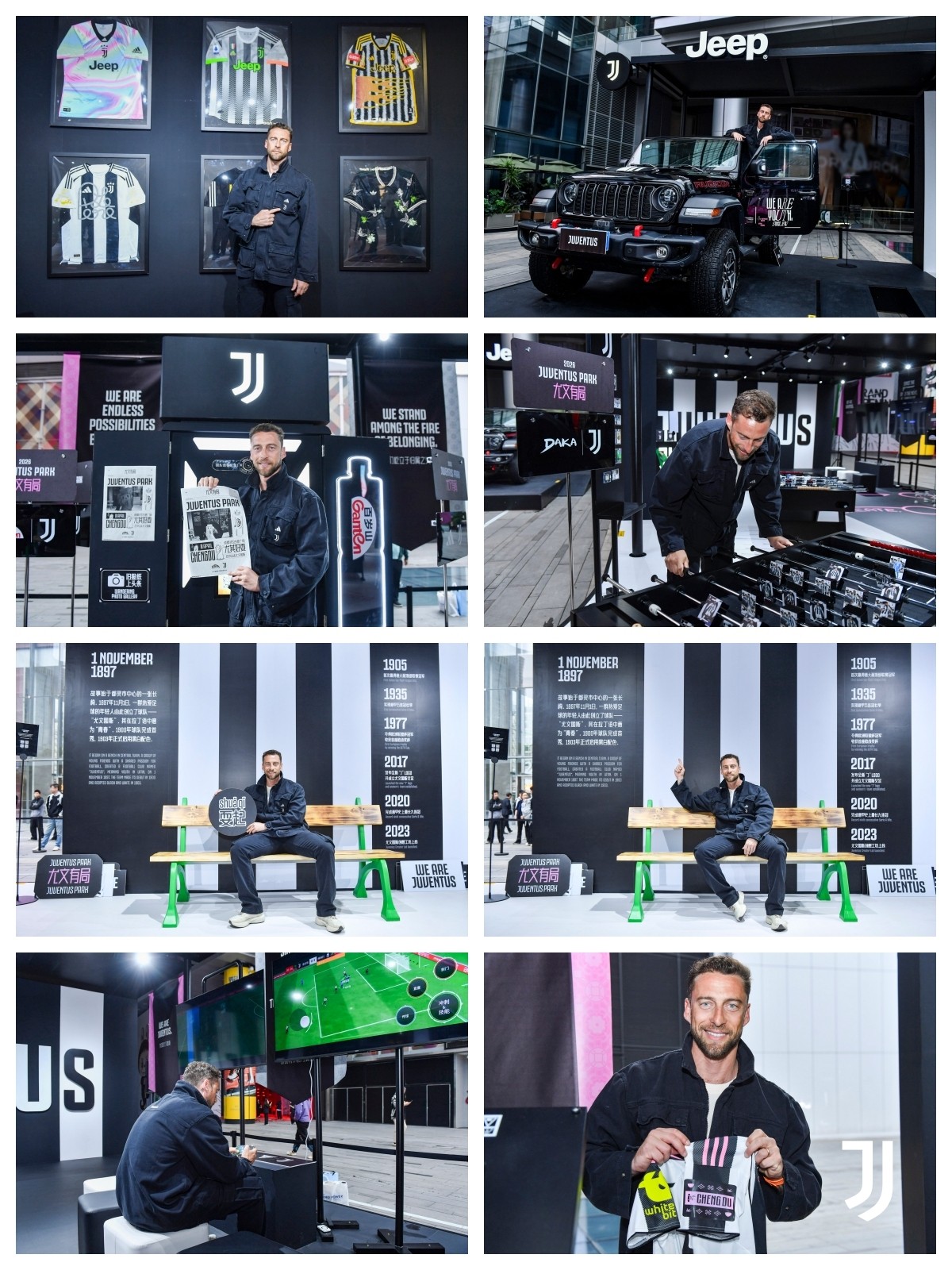 各合作伙伴以品牌独有的方式诠释与尤文图斯深厚的情谊,将尤文图斯元素与成都本土特色巧妙结合,打造各具亮点的互动体验区:adidas推出融合成都特色的限量版球衣臂章;Jeep带来尤文图斯主题拉花展车;百岁山打造更衣室风格拍照打卡墙及流行前沿的主题拍报机;EA Sports的尤文图斯主题游戏体验区;DAKA则推出球员卡面定制版桌上足球。参与者领取互动集章卡,完成任务即可解锁专属体验与限定好礼,各展区既彰显锐意革新的先锋精神,更与尤文图斯共同演绎青春跃动的品牌内核。