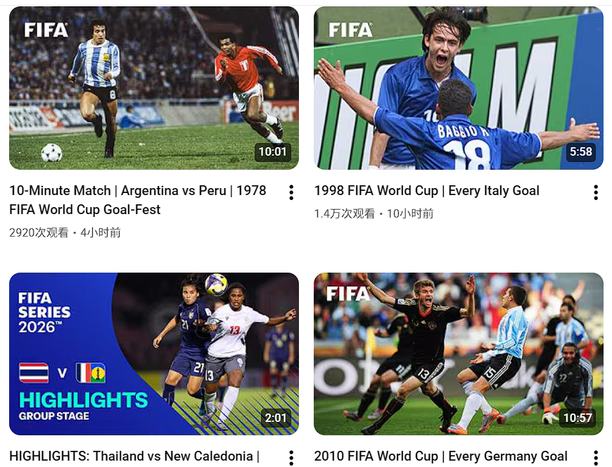 比赛直播之外,FIFA还会往YouTube上放更多世界杯老内容,包括历届比赛录像和一些经典时刻。据体育产业生态圈观察,双方合作官宣后,FIFA主账号的内容更新频率和上传数量已明显增加,某种程度上,相当于把此前更多放在FIFA+上的一部分内容,进一步搬到了这个更开放、用户规模也更大的平台上。