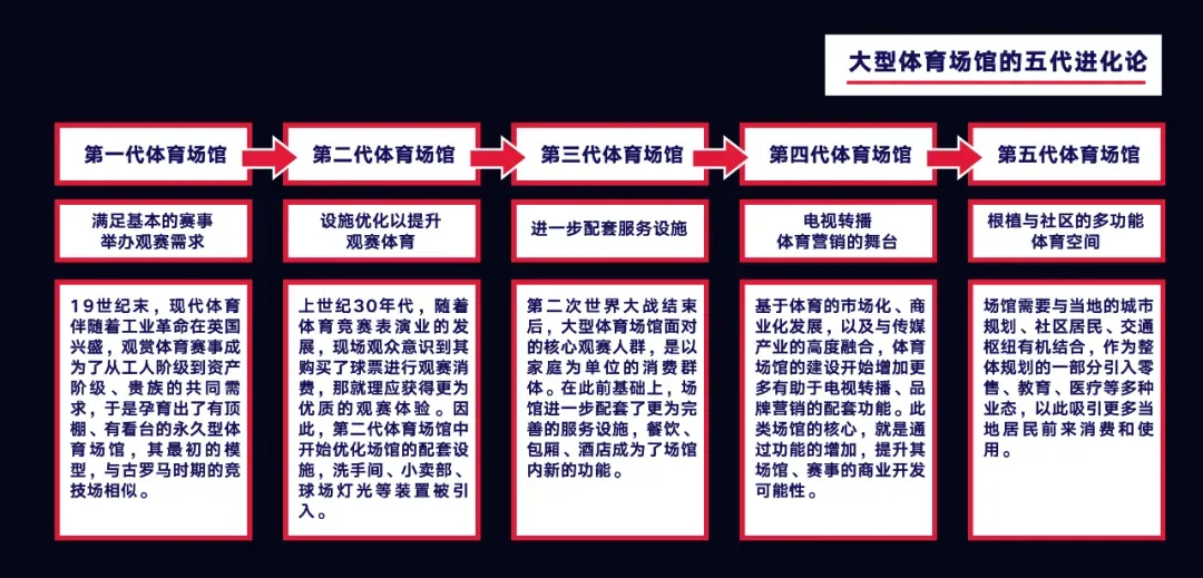 早在2005年,全球知名的体育场馆设计师罗德·希尔德(Rod Sheard)先生就提出了「运动空间五代进化论」。体育场馆由最初满足基本赛事和观赛需求,逐步被赋予社交、休闲、商业化、电视转播等功能,最终进化至第五代模式——即成为城市与社区发展的重要工具。