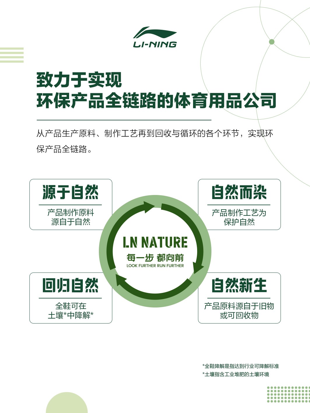 作为国内体育用品与纺织鞋服行业的领军企业,李宁以科技创新驱动产品绿色变革,从原料、工艺、回收再利用到生态循环四个环节出发,形成“源于自然、自然而染、自然新生、回归自然”的环保产品全链路,引领鞋服行业向绿而行。